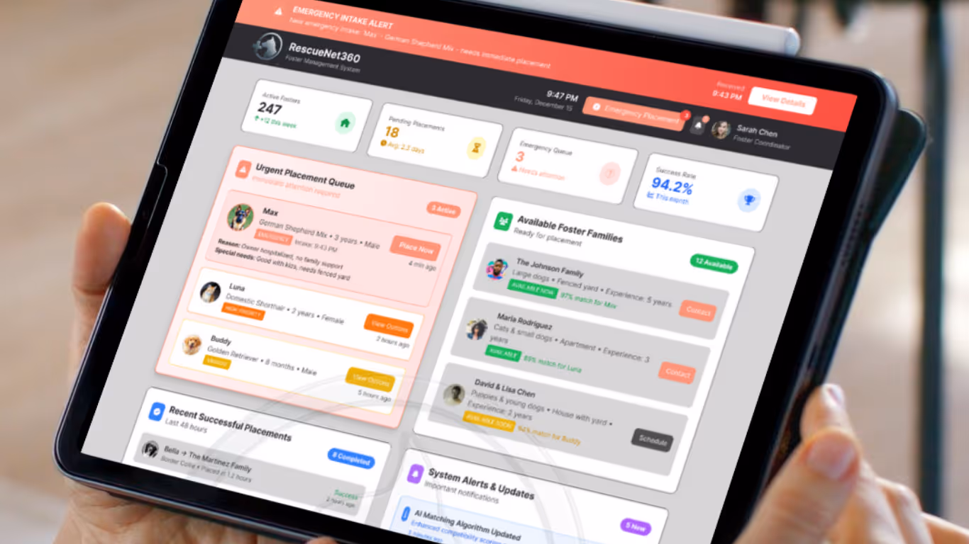 Right now, somewhere in America: A family is posting flyers for their lost dog. That exact dog was just brought to a shelter three miles away, but no one knows. A rescue coordinator is calling fifty foster families one by one, trying to find emergency placement. Half won't answer. The animal dies while she's still making calls.